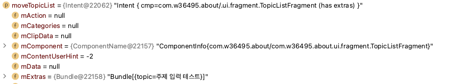 데이터를 받는 화면인 TopicListFragment 에서 디버깅해보면 일단 해당 Intent 의 mExtras 에 데이터가 있는 것을 확인할 수 있다.
